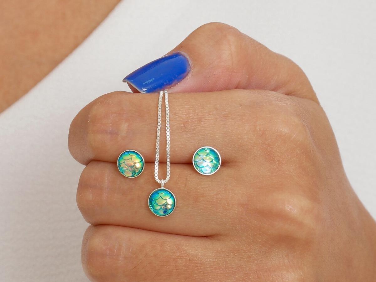 Colar feminino veneziana de 45 cm com pingente Escama de sereia Verde e 1 par de brincos escama sereia